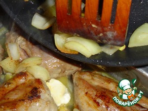 Затем перекладываем в него поджаренное мясо, выкладываем обжаренный лук. -