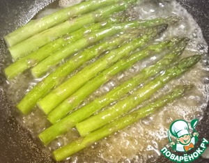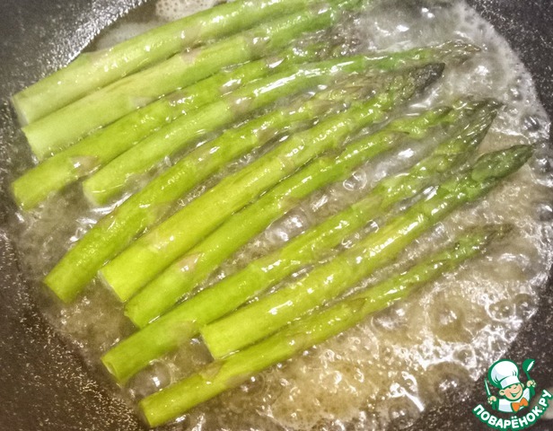 На сковороде растопить половину сливочного масла, выложить спаржу и готовить 8 минут.