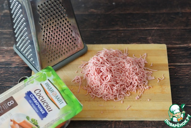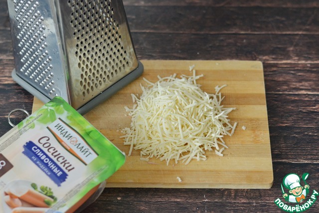 Натрите на мелкой тёрке сосиски.
