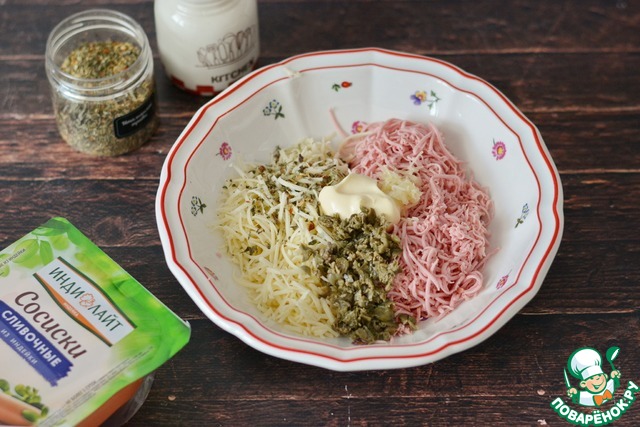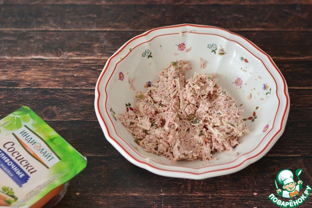 В миске соедините натёртые сосиски и сыр. Добавьте нарубленные мелко каперсы (или нарезанные мелко зелёные оливки).