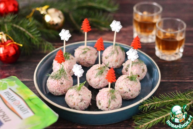 Выложите закусочные шарики на тарелку, украсьте зеленью Для удобства воткните в них шпажки для канапе.