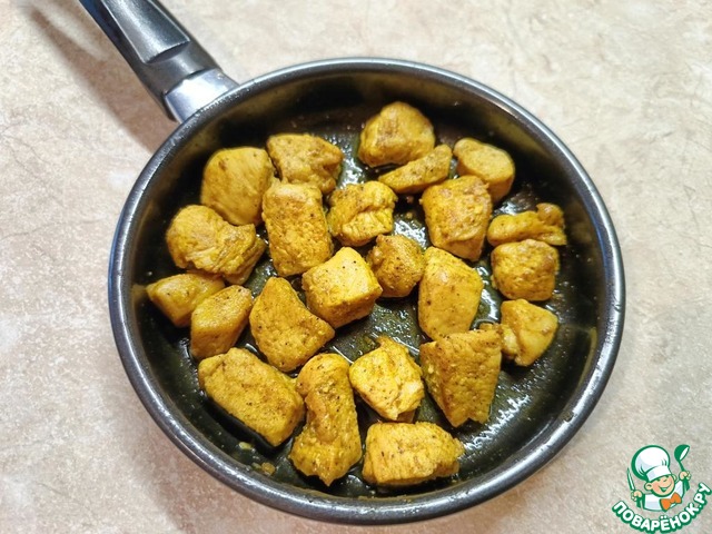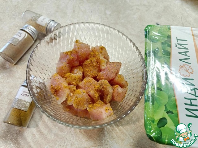 Индейку нарезать кубиками среднего размера. Приправить карри, сухим чесноком, перцем, солью. Оставить на 15 минут.