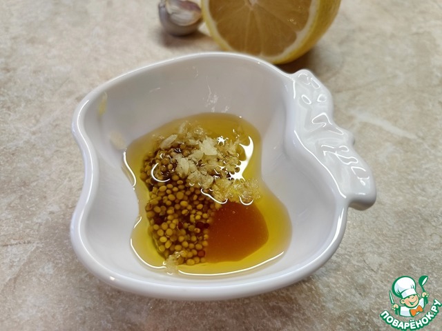 Приготовить заправку для салата. Смешать горчицу с зернами, измельченный зубчик чеснока, мед. Влить масло и сок лимона. Вилкой взбить до состояния эмульсии.