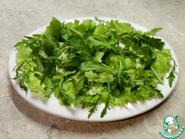 Собираем салат. На плоское блюдо уложить порванные листья салата и горсть рукколы. Или любой салатный микс. Полить частью заправки.