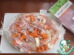 Филе индейки ТМ Индилайт, морковь, луковицу нарежьте на не большие кусочки. Перемешайте с солью и молотым перцем, переложите в пакет для запекания и поставьте в разогретую до 170* духовку. Запекайте до готовности.