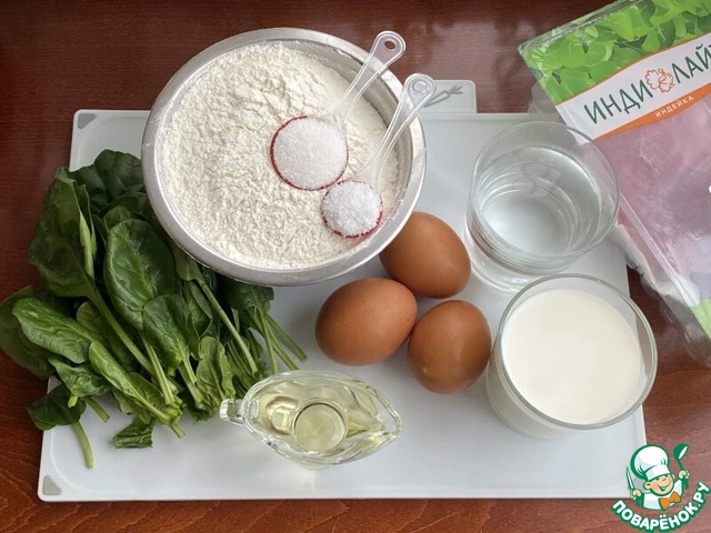Приготовим шпинатные блины. Для этого подготовьте все необходимые ингредиенты.