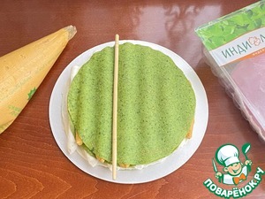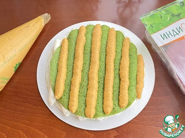 Накройте блином и шпажкой сделайте углубления между полосками крема.