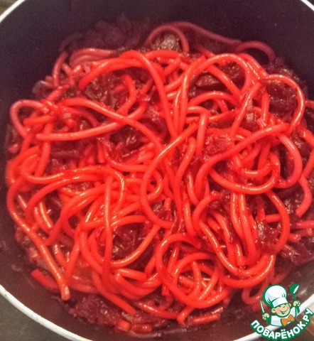 За минуту до готовности пасты в кастрюлю добавить свеклу. Свекольная паста приобретает красивый ярко-розовый оттенок. Процедить, оставив стакан воды из под свекольной пасты. Затем, пару минут варить пасту со свеклой, порционно подливая оставшуюся воду до полного перемешивания и кремообразности.