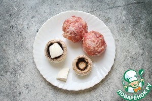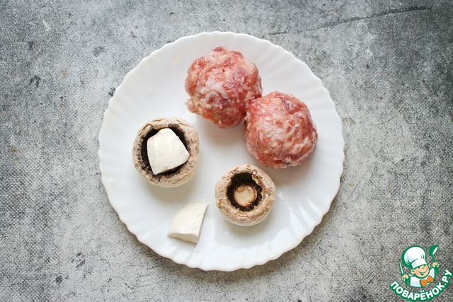 У шампиньонов удалите ножки и снимите верхний слой у шляпок. Каждый гриб посолите внутри, немного смажьте маслом внутри и снаружи шляпки. Моцареллу нарежьте на четыре части и каждую положите внутрь шляпки. Фарш разделите на четыре части и каждую шляпку "укутайте" в оболочку из фарша, плотно прижимая, формируя шар.