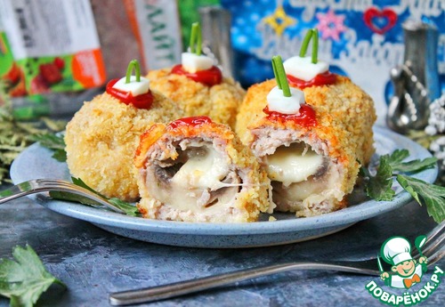 Уверена, что состав этого блюда не угадает никто, пока не разрежут. А вот тогда оно вызовет бурю эмоций и одобрения. Ведь даже невозможно предположить, что в хрустящей "шубке" спрятано сразу грибы, мясо и сыр. Если интересно, заходите и может идея пригодится для новогоднего стола или другого праздника.