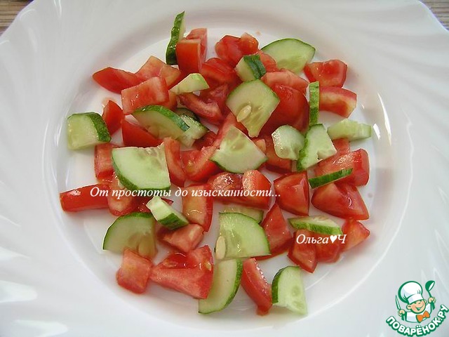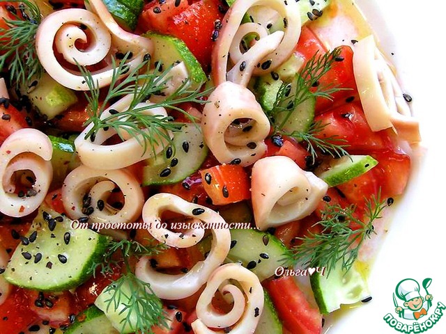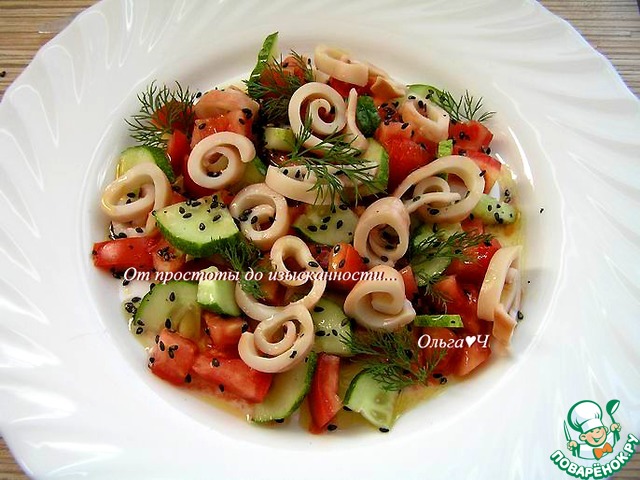 Очищенного кальмара опустите в кипящую подсоленную воду, варите 2 минуты, остудите. Нарежьте огурец и помидор, разложите по тарелкам.
