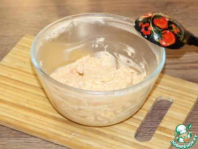 7. Пока остывает фарш, приготовим начинку. Смешиваем 2 вареных яйца со сливочным маслом и томатным кетчупом. Солим и перчим и измельчаем массу блендером до однородности.
