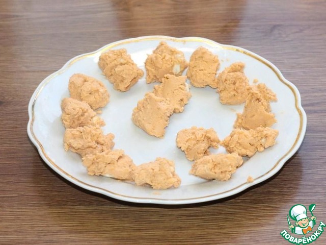 8. Делим начинку на 15 частей, можно слегка обвалять в муке. Накрываем блюдо пленкой и убираем в морозилку на 30 минут.