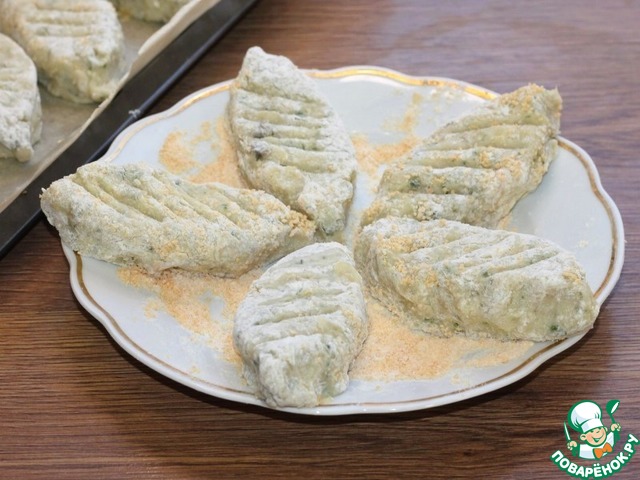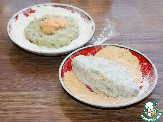 10. Формируем котлеты. Руки и ложку смачиваем водой. Берем комочек мясного фарша и расплющиваем, а затем кладем начинку. Закрываем начинку со всех сторон, как пирожок. Макаем котлету в муку, а затем (по желанию) в панировочные сухари.
