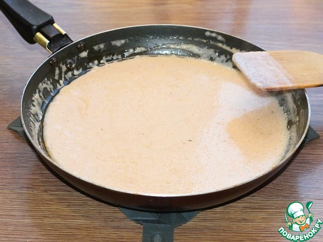 16. Разогреваем сливочное масло (20 г) и выливаем молоко (200 мл). Доводим молоко до кипения и тонкой струйкой выливаем мучную смесь. На слабом огне, периодически помешивая, доводим соус до готовности. Готовый соус по консистенции, как жидкая (10%) сметана. При остывании, соус загустеет.