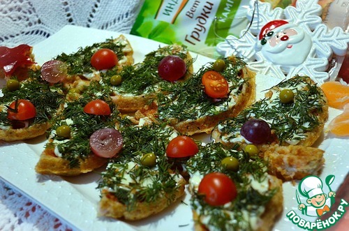 Смешать сливочный сыр и горчицу, мелко нарубить вымытый и обсушенный укроп. Ломтик вафли намазать сыром и посыпать укропом. Украсить черри, виноградом, горошком ( кукурузой, зернами граната). Подать к столу.