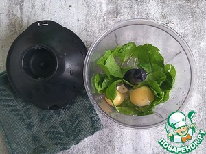 Нам нужен измельчитель или блендер, можно использовать мясорубку, чтобы измельчить шпинат. В чашу измельчителя выкладываем шпинат и яйца. Измельчаем.