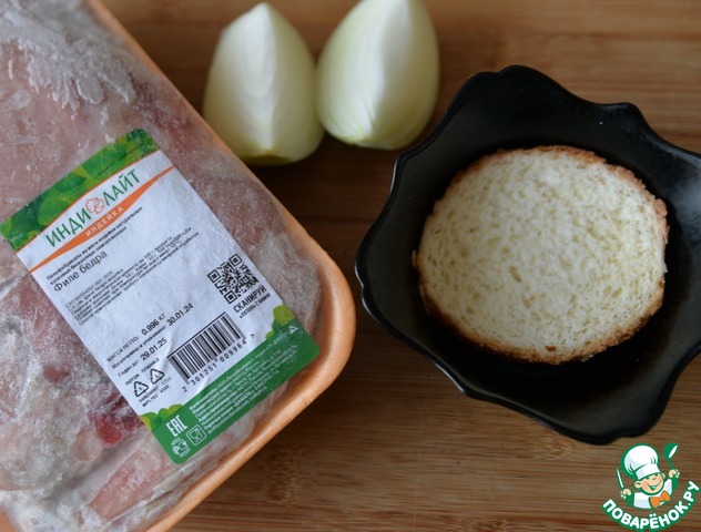 Перекручиваем филе индейки с луком и замоченным в молоке хлебом или батоном. У меня филе бедра индейки Индилайт.