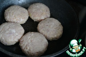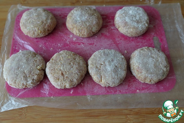 Формуем котлеты. Я люблю делать круглые котлеты, как биточки. Это на ваше усмотрение. У меня котлеты, в среднем, весом по 100 гр. Панируем котлеты в муке или сухарях. Отправляем в холодильник. Котлеты из холодного фарша получаются более сочными, из них не выходит влага при жарке, она сразу "закупоривается" в котлете при большой температуре.