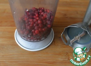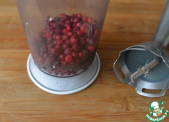 Берём бруснику, у меня мороженная. Можно брать клюкву, но вкус, конечно, будет иной. Измельчаем бруснику блендером.
