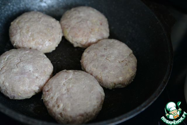 Жарим котлеты. На горячую сковороду наливаем растительное масло. Из холодильника кладём полуфабрикаты котлет. Начинаем жарить на максимуме, чтобы на котлетах образовалась корочка. Далее убавляем огонь до среднего, жарим 5 минут при открытой крышке.