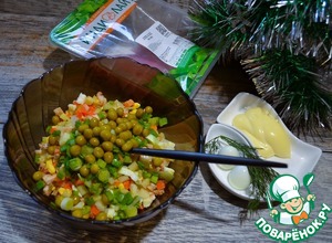 При подаче добавить зелёный горошек, зелень, посолить, заправить майонезом.