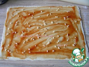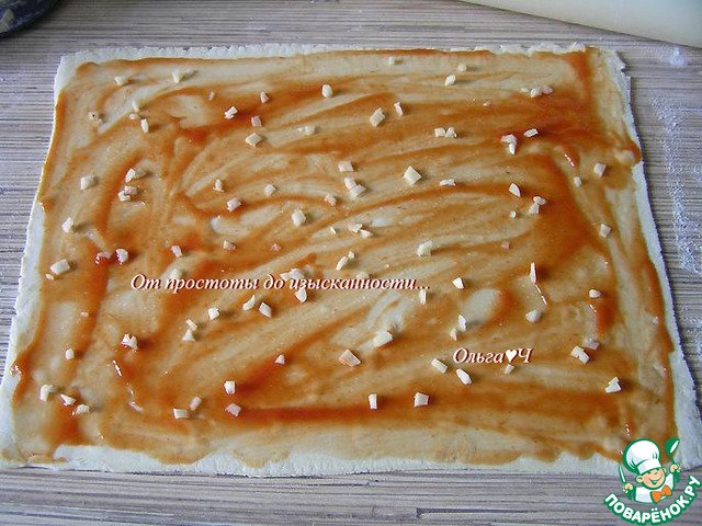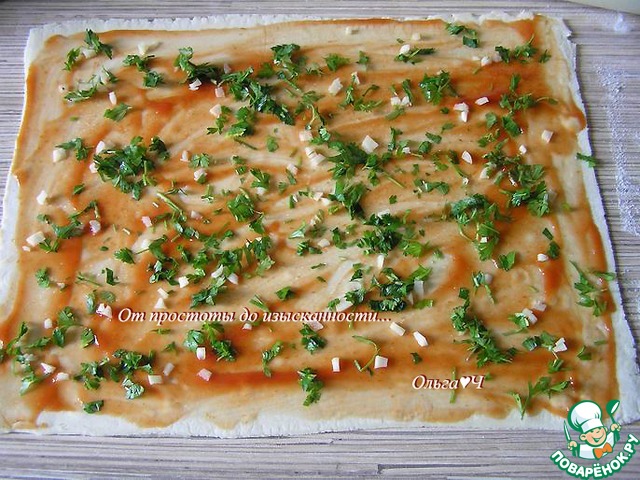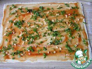 Слоеное тесто разморозьте, немного раскатайте, присыпав стол мукой. Смажьте тесто кетчупом, посыпьте нарезанным чесноком.