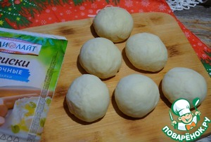 Выбродившее тесто обмять, разделить на колобки по 100 г., подкатать, накрыть, оставить на 10-15 минут.
