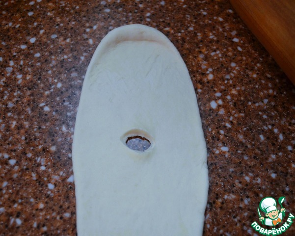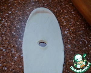 Затем каждый колобок раскатать в длинный овал, 6-7 см. * 15-17 см.. По центру сделать небольшой надрез.