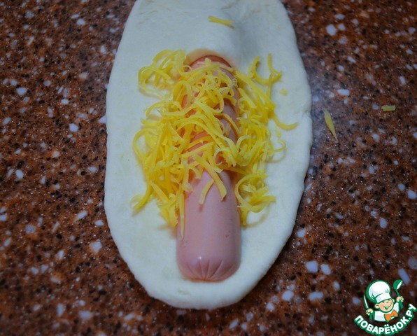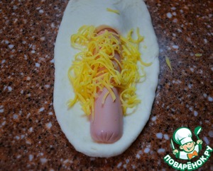 Половинку сосиски поместить в отверстие, посыпать сыром. Накрыть второй половиной теста. -