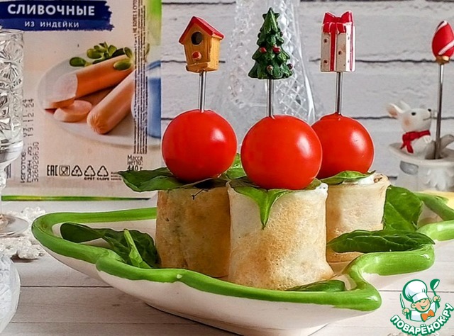 Срезаем края блина с обеих сторон (без сосиски). Делим завёрнутую сосиску на 3 ровные части. Выкладываем в посуду для подачи, стоя (не на боку). На верх выкладываем немного соуса, чтобы приклеить листик шпината. На шпинат кладём помидор-черри. Прокалываем "конструкцию" шпажкой. Всё повторите с остальными блинами.