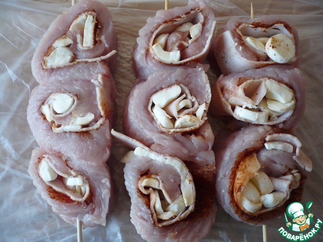 Сверните стейки в рулетики, выложите горизонтально. Нанизать каждый рулетик на три шпажки.