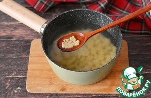 Вскипятите воду с небольшим количеством соли и отварите в кипящей воде макароны до состояния аль-денте. Затем откиньте на сито. Немного воды от варки макарон сохраните. -