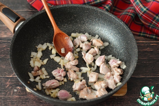 А пока варятся макароны, нарежьте мелко филе бедра индейки и лук. Обжарьте их на разогретом масле до золотистой корочки примерно 5-8 минут.
