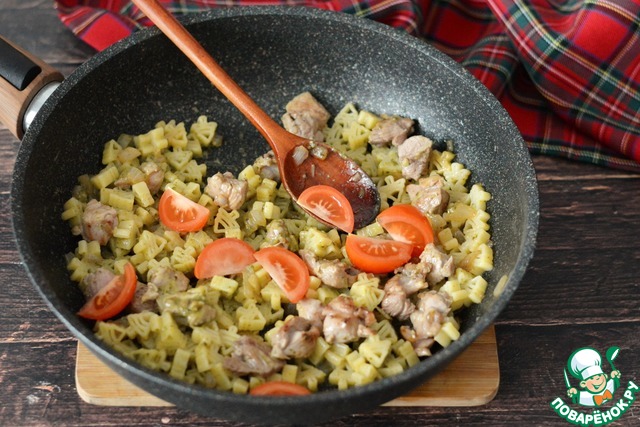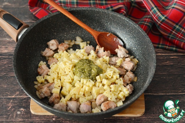 К обжаренной индейке добавьте отваренные макароны и соус песто.