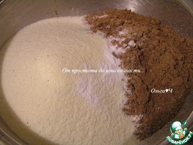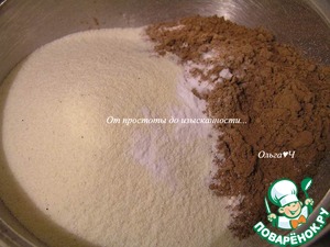 Для бисквита смешайте муку, манку, какао, соль, соду и ванилин.
