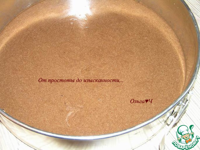 На остывший испеченный корж в форме вылейте манный крем-мусс. Уберите в холодильник до застывания. ***Поскольку предстояла длительная транспортировка торта, я не рискнула разрезать бисквит на 2 коржа, хотя его толщина позволяла это сделать. В домашних условиях, конечно, разделите бисквит и мусс на 2 части и чередуйте слои. Хотя и так хорошо получилось.***