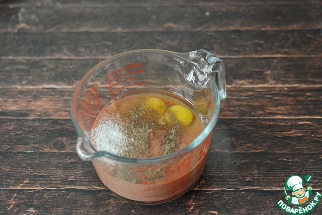 Переложите получившуюся печёночную массу в миску, вбейте яйца, добавьте соль и перец, тщательно смешайте венчиком.