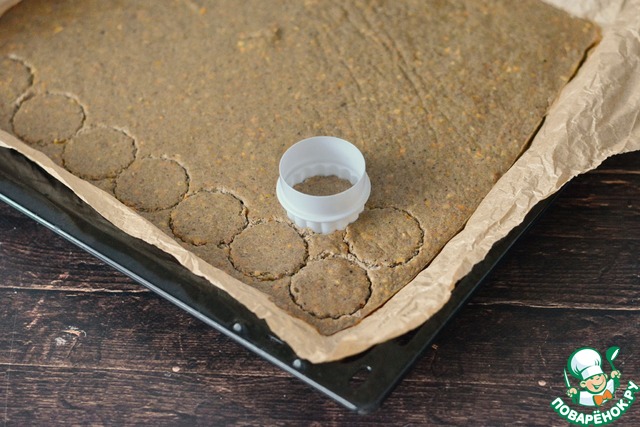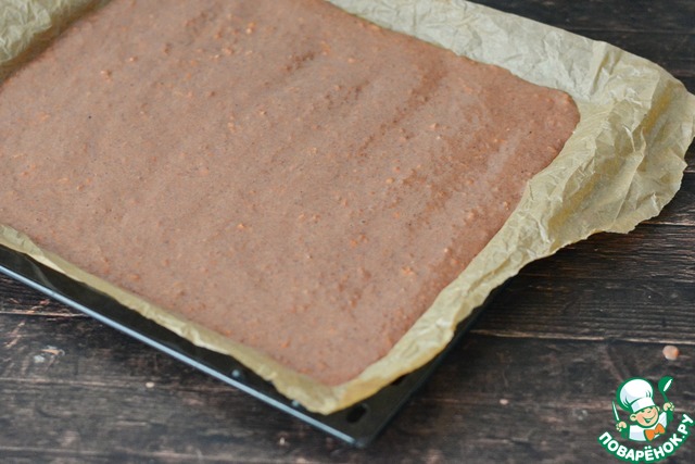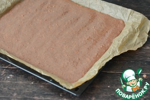 Застелите противень пергаментом для выпечки и вылейте печёночную массу на пергамент, распределите ложкой равномерно, чтобы получился тонкий слой.