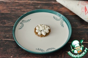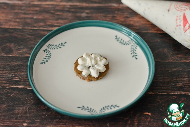 Возьмите печеночный лепесток и отсадите из кондитерского мешка крем на него точечно. -