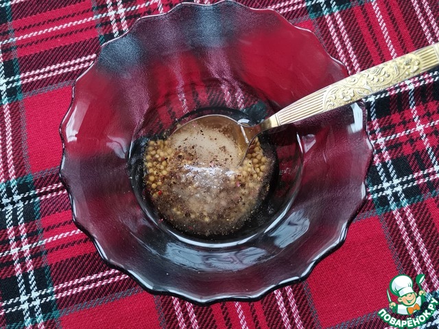 В маленькой вазочке перемешать горчицу, соль, сахарный песок, сок лимона, свежемолотый чёрный перец и растительное масло. Заправка готова. -