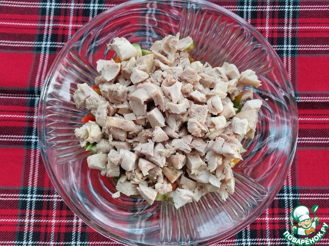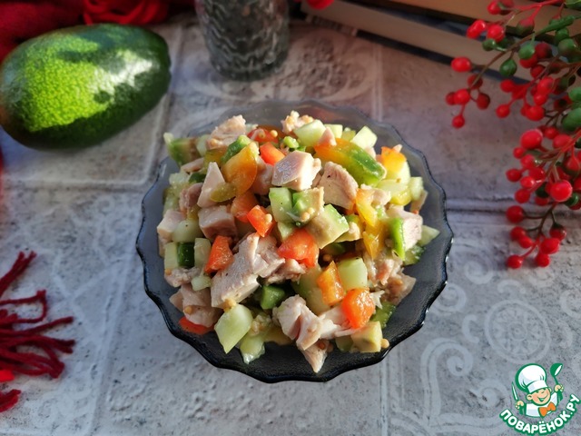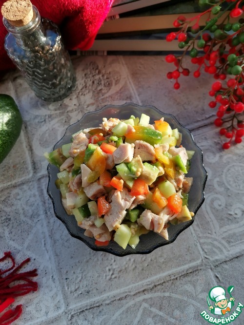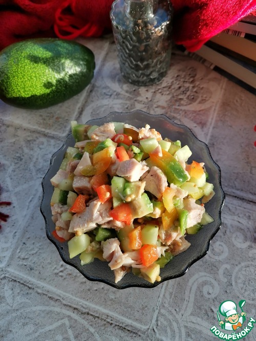 Простой, полезный и яркий салат с авокадо, огурцом и болгарским перцем - отличный выбор для легкого обеда или ужина. Сочетание свежих овощей, маслянисто-кремового авокадо и нежного куриного мяса порадует Вас своими вкусовыми качествами. Прошу к столу!