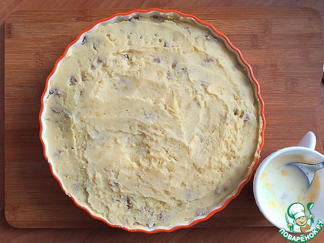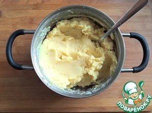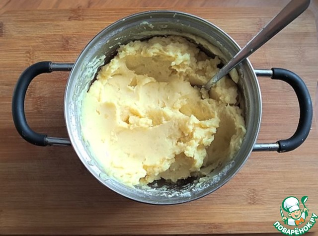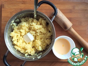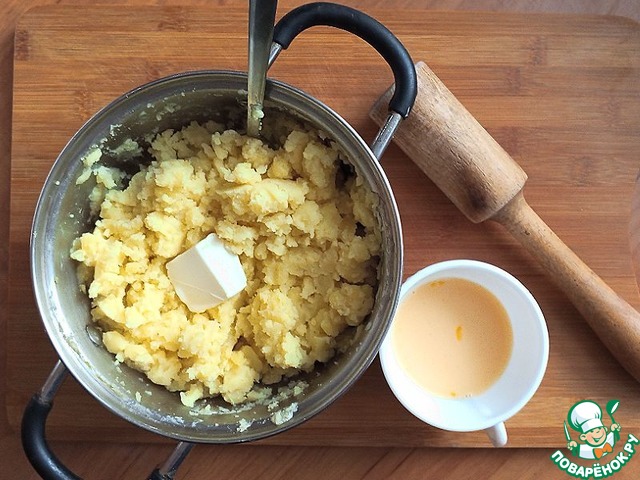 Нужно сварить картофель для пюре. Приготовить смесь яйца с молоком и солью, сливочное масло. Со сваренного картофеля сливаем полностью воду. Толкушкой мнём, добавляем сливочное масло. Даём немного остыть пюре.