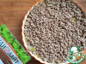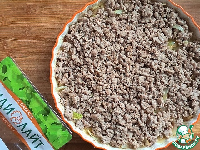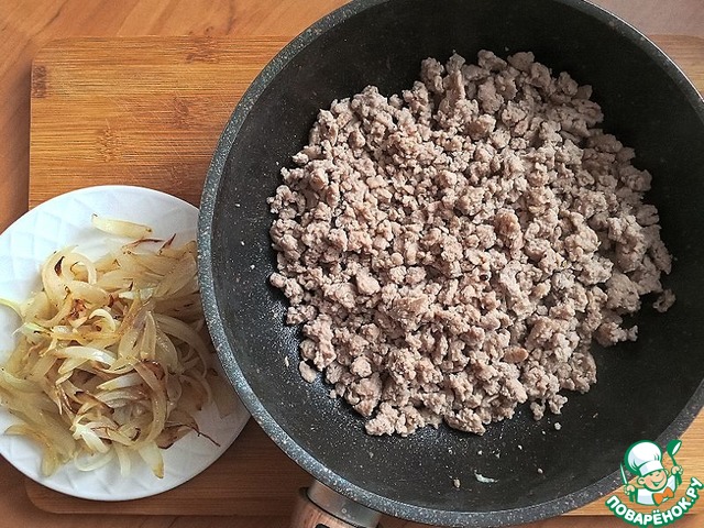 Отдельно от фарша обжариваем на сковороде лук, порезанный перьями в сливочном масле. Переложим лук на тарелку. В этой же сковороде, выложив ещё кусочек масла, обжарим до готовности фарш. Посолим и поперчим его по вкусу.