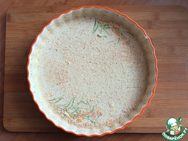 Приготовим форму праздничную, в которой и будем подавать "Яблочник". Форма у меня D-24 см и высотой-4 см. Обмазываем низ и бока формы маслом сливочным. Присыпаем панировочными сухарями белыми.
