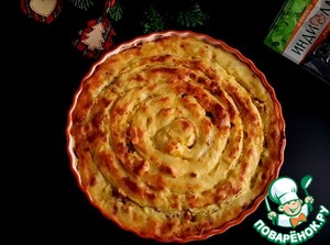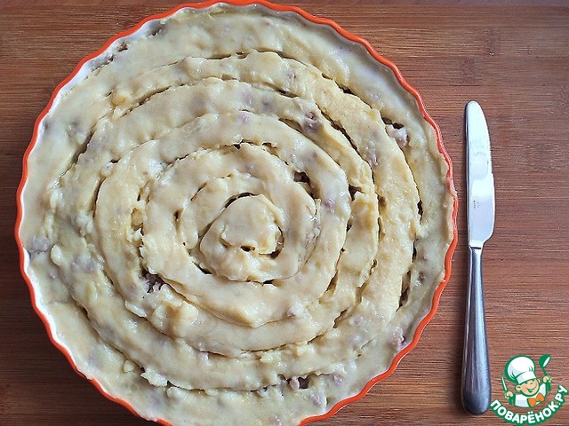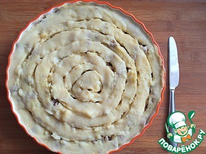 Равномерно заливаем верх смесью. Теперь ножом надсекаем верх "Яблочника" по спирали (см. фото). Лучше использовать нож с круглым носиком. Да всё равно чем надсечь. Заливка, которой мы залили верх, попадёт в рассечки равномерно. Ставим "Яблочник" в духовку, выставив Т-180 С на 60 минут. Ориентируйтесь по своей духовке. В принципе, все ингредиенты готовы, нужно только, чтобы "Яблочник" схватился, вот яйцо - то нам и поможет и в пюре, и в заливке. Ещё дадим ему красиво запечься румяной корочкой.