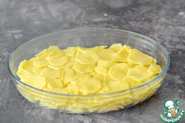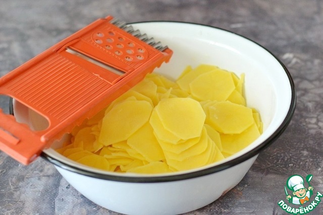 На специальной шинковке нашинкуйте картофель тончайшими ломтиками. Можно это сделать и вручную. Ломтики должны быть толщиной не более 1-2 мм.