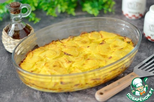 Поставьте в горячую духовку при температуре 160-180°С и запекайте около 30-40 минут. Картофель должен стать очень мягким. Проткните запеканку в центре ножом, он должен войти в картошку легко, как в кусок масла. Если ваша духовка сильно подрумянивает верх, то можно на первом этапе накрыть форму фольгой, а затем снять её и подрумянить верх запеканки.