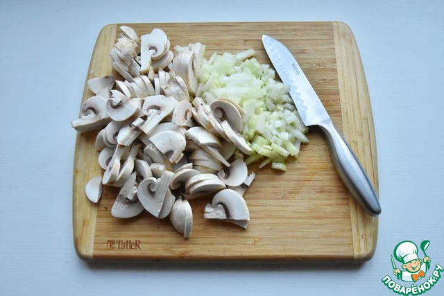 Репчатый лук нарезать кубиком, шампиньоны пластинками. Мелкие грибы можно оставить целыми.