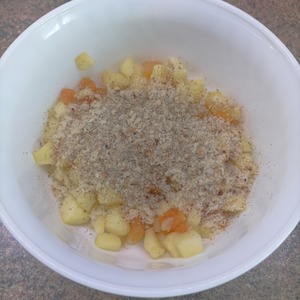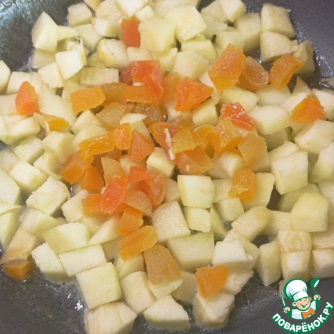 Яблоко очистить от кожицы, семян и нарезать кубиками. Полить лимонным соком. Курагу также нарезать кубиками. В сковороде разогреть сливочное масло и обжаривать яблоки с курагой 3 минуты.